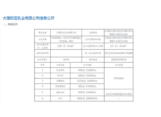 云南歐亞乳業(yè)有限公司(二廠)信息公開